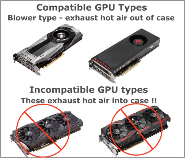 We have worked hard to ensure that this design gives you the best experience. However, this is not a case for heavy overclocking, if that is what you are after please buy a tower, unless you fully understand how to get the best setup to enable over clocking in a small form factor case. To get the best from this system you must select a blower style GPU from either NVidia or AMD. The case is designed to take air from the front of the case into the fan and then exhaust at the rear of the case. Any residual heat in the case is removed by the rear panel trio of quiet fans, but cannot cope with heat from incompatible type. Also note the lower list may not fit either.