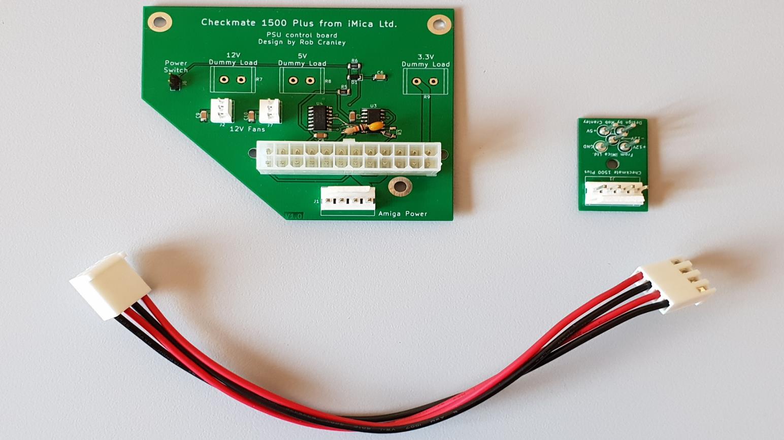 This kit comprises of two boards and a cable. One board mounts to side of case, one plugs into the rear of the Amiga's power input and a cable connects the two. You then connect the front panel power switch to the main board and this will start and stop the system.